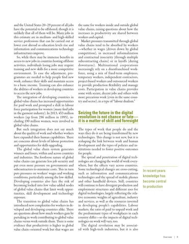 and the United States 20–29 percent of all jobs have the potential to be offshored, though it is unlikely that all of them will be. Many jobs in this estimate are in medium- and high-skilled service professions that can be carried out at lower cost abroad as education levels rise and information and communications technology infrastructures improve. So, while there may be immense benefits in access to new jobs in countries hosting offshore activities, individuals losing jobs may require training and new skills for a more competitive environment. To ease the adjustment, programmes are needed to help people find new work, enhance their skills and maintain access to a basic income. Training can also enhance the abilities of workers in developing countries to access the new jobs. The integration of developing countries in global value chains has increased opportunities for paid work and prompted a shift in labour force participation for women (many find jobs in the garment industry). In 2013, 453 million workers (up from 296 million in 1995), including 190 million women, were involved in global value chains. But such integration does not say much about the quality of work and whether workers have expanded their human capabilities. There are concerns about levels of labour protection and opportunities for skills upgrading. The global value chain system generates winners and losers, within and across countries and industries. The footloose nature of global value chains can generate less job security and put even more pressure on governments and subcontractors to minimize costs. This in turn puts pressures on workers’ wages and working conditions, particularly among the low skilled. Developing countries also face the risk of becoming locked into low value-added nodes of global value chains that limit work opportunities, skill development and technology exposure. The transition to global value chains has introduced new complexities for workers in developed and developing countries alike. There are questions about how much workers gain by partaking in work contributing to global value chains versus work outside them. There is some evidence that productivity is higher in global value chain–oriented work but that wages are