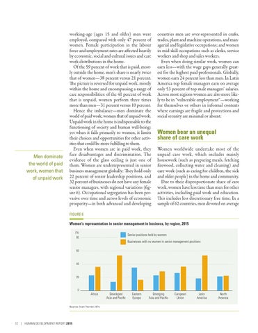 working-age (ages 15 and older) men were employed, compared with only 47 percent of women. Female participation in the labour force and employment rates are affected heavily by economic, social and cultural issues and care work distributions in the home. Of the 59 percent of work that is paid, mostly outside the home, men’s share is nearly twice that of women—38 percent versus 21 percent. The picture is reversed for unpaid work, mostly within the home and encompassing a range of care responsibilities: of the 41 percent of work that is unpaid, women perform three times more than men—31 percent versus 10 percent. Hence the imbalance—men dominate the world of paid work, women that of unpaid work. Unpaid work in the home is indispensable to the functioning of society and human well-being: yet when it falls primarily to women, it limits their choices and opportunities for other activities that could be more fulfilling to them. Even when women are in paid work, they face disadvantages and discrimination. The evidence of the glass ceiling is just one of them. Women are underrepresented in senior business management globally: They hold only 22 percent of senior leadership positions, and 32 percent of businesses do not have any female senior managers, with regional variations (figure 6). Occupational segregation has been pervasive over time and across levels of economic prosperity—in both advanced and developing