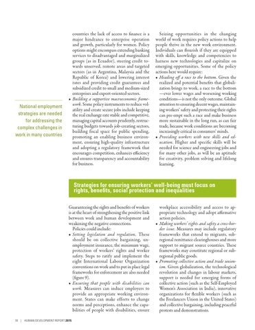 Seizing opportunities in the changing world of work requires policy actions to help people thrive in the new work environment. Individuals can flourish if they are equipped with skills, knowledge and competencies to harness new technologies and capitalize on emerging opportunities. Some of the policy actions here would require: • Heading off a race to the bottom. Given the realized and potential benefits that globalization brings to work, a race to the bottom —ever lower wages and worsening working conditions—is not the only outcome. Global attention to ensuring decent wages, maintaining workers’ safety and protecting their rights can pre-empt such a race and make business more sustainable in the long run, as can fair trade, because work conditions are becoming increasingly critical in consumers’ minds. • Providing workers with new skills and education. Higher and specific skills will be needed for science and engineering jobs and for many other jobs, as will be an aptitude for creativity, problem solving and lifelong learning.