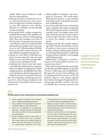 equally, fathers may be induced to make more use of paternal leave. • Enlarging care options, including day-care centres, after-school programmes, senior citizens’ homes and long-term care facilities. Employers can also offer child-care onsite. Another alternative is to subsidize care work through vouchers and tickets. • Encouraging flexible working arrangements, including telecommuting. There should be sufficient incentives to return to work after giving birth. These may encompass reservation of jobs for women on maternity leave for up to a year. Women could also be offered benefits and stimulus (for example, salary increases) to return to work. Telecommuting and flexible hours can also allow women and men to address imbalances in paid and unpaid work. • Valuing care work. Efforts would help raise policy awareness about the value care work brings to society and could encourage different options for rewarding such work. • Gathering better data on paid and unpaid work. National statistical systems, using more female investigators and appropriate samples and questionnaires, should gather better data on the distribution of paid and unpaid work. Targeted measures for sustainable work may focus on terminating, transforming and creating work to advance human development and environmental sustainability. Policy measures may focus on: