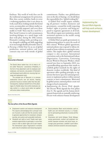 forebears. This world of work does not fit the traditional arrangements for protection. How does society mobilize funds to cover a widening population that is not always in work, reach those working outside the formal sector, accommodate new labour market entrants (especially migrants) and cover those unable to work? There may be a need for a New Social Contract in such circumstances involving dialogue on a much larger scale than took place during the 20th century. Denmark is making strides providing security alongside reskilling and skills upgrading in an increasingly flexible job market (box 4). • Pursuing a Global Deal. In an era of global production, national policies and social contracts may not work outside of global BOX 4 Flexicurity in Denmark The Danish labour market has a lot of what is often called “flexicurity”: coexistence of flexibility, in the form of low adjustment costs for employers and employees, and security, a by-product of Denmark’s well developed social safety net, ensuring high coverage and replacement rates. The principal aim of flexicurity is to promote employment security over job security, meaning protection focuses on workers rather than their jobs. Consequently, employers benefit from all the advantages of a flexible labour force while employees can take comfort in a robust social safety net applied with active labour market policies. Source: World Bank 2015b.