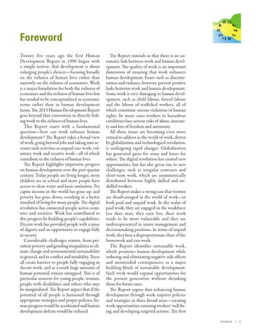 The Report reminds us that there is no automatic link between work and human development. The quality of work is an important dimension of ensuring that work enhances human development. Issues such as discrimination and violence, however, prevent positive links between work and human development. Some work is very damaging to human development, such as child labour, forced labour and the labour of trafficked workers, all of which constitute serious violations of human rights. In many cases workers in hazardous conditions face serious risks of abuse, insecurity and loss of freedom and autonomy. All these issues are becoming even more critical to address as the world of work, driven by globalization and technological revolution, is undergoing rapid changes. Globalization has generated gains for some and losses for others. The digital revolution has created new opportunities, but has also given rise to new challenges, such as irregular contracts and short-term work, which are asymmetrically distributed between highly skilled and unskilled workers. The Report makes a strong case that women are disadvantaged in the world of work—in both paid and unpaid work. In the realm of paid work, they are engaged in the workforce less than men, they earn less, their work tends to be more vulnerable and they are underrepresented in senior management and decisionmaking positions. In terms of unpaid work, they bear a disproportionate share of the housework and care work. The Report identifies sustainable work, which promotes human development while reducing and eliminating negative side effects and unintended consequences, as a major building block of sustainable development. Such work would expand opportunities for the present generation without shrinking those for future ones. The Report argues that enhancing human development through work requires policies and strategies in three broad areas—creating work opportunities, ensuring workers’ well-being and developing targeted actions. The first Foreword | iii