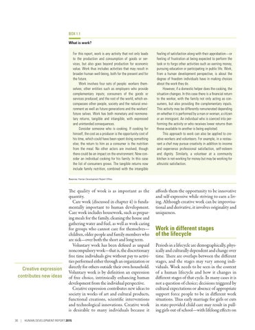The quality of work is as important as the quantity. Care work (discussed in chapter 4) is fundamentally important to human development. Care work includes housework, such as preparing meals for the family, cleaning the house and gathering water and fuel, as well as work caring for groups who cannot care for themselves— children, older people and family members who are sick—over both the short and long term. Voluntary work has been defined as unpaid noncompulsory work—that is, the discretionary free time individuals give without pay to activities performed either through an organization or directly for others outside their own household. Voluntary work is by definition an expression of free choice, intrinsically enhancing human development from the individual perspective. Creative expression contributes new ideas to society in works of art and cultural products, functional creations, scientific interventions and technological innovations. Creative work is desirable to many individuals because it
