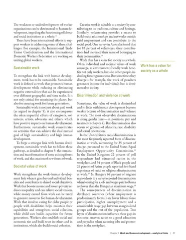 Societal value of work Work strengthens the work–human development link when it goes beyond individual benefits and contributes to shared social objectives. Work that boosts income and lowers poverty reduces inequality and can relieve social tension, while money earned from work can be taxed to generate resources for human development. Work that involves caring for older people or people with disabilities helps maintain their capabilities and strengthens social cohesion, while child care builds capacities for future generations. Workers also establish social and economic ties and build trust in others and in institutions, which also builds social cohesion.