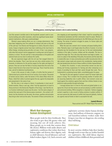 Building peace, restoring hope: women’s role in nation building Just like women’s invisible work in the household, women’s work in community building and conflict resolution, which has significant human development implications, often goes unacknowledged. Women’s peace-making efforts are not a strange phenomenon; they have been happening since the outbreak of violence and wars at the end of the cold war. From Bosnia and Herzegovina to Liberia, Burundi to Sierra Leone, Congo to Uganda women have been mobilizing at the local level to effect change, including during and after civil wars. In fact, I can unequivocally state that women’s active engagement in ending wars and all types of violence is critical. The only sad fact is that policymakers at the global and national levels are too slow to embrace this reality. My own experience began with the civil war that ravaged Liberia for almost two decades. There I saw how war can strip a whole society of its humanity, its deference for life and the respect for the rights and dignity of persons. How war can tear the fabric of society, break down the norms that keep in check the terror that comes from man’s ego. There I lived the rule by man, and all its diabolical manifestations. It was in this vacuum of order, of rights, of civility that the women of Liberia stood up to reclaim the soul of our country, of our society. Thousands of women across Liberia, under the banner of the Liberia Mass Action for Peace, risked their safety to protest against the war, against the despicable acts perpetrated in the name of war. But this story is not unique to Liberia. It reverberates in most war-affected societies. About a year ago, when I had the opportunity to travel to three provinces in the Democratic Republic of the Congo, I saw that the story of women mobilizing for peace was the same. I met the same category of women that were part of the Liberian peace movement—the context is different, but the characters are the same; the virtues, qualities and principles they bring to their work are the same. The women of these communities are