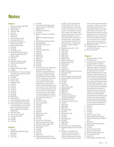 World Bank 2015f; ILO 2014c. World Bank 2015f. Human Development Report Office calculation based on ILO 2014c. FAO 2015. The Food and Agriculture Organization figures for the economically active population in agriculture are higher than the International Labour Organization figures on those employed in agriculture because the Food and Agriculture Organization defines the economically active population in agriculture (agricultural labour force) as the part of the economically active population engaged in or seeking work in agriculture, hunting, fishing or forestry, while the International Labour Organization definition for “employment by sector, agriculture” includes only employees (wage and salary earners) and excludes the self-employed and contributing family members. The employment share of the agricultural sector estimated by the International Labour Organization is lower than that estimated by the Food and Agriculture Organization. FAO 2014. FAO 2014. FAO 2014. ILO 2013d. ILO 2014c. Timmer and others 2014a. McKinsey Global Institute 2012a. International Federation of Robotics 2014. WEF 2012a. McKinsey Global Institute 2012a. Rodrik 2015a. ILO 2014c. Warhurst and others 2012. Timmer and others 2014a. McKinsey Global Institute 2013. Social Tech Guide 2015. Cowen 2013. Dobbs, Manyika and Woetzel 2015. Notes | 187