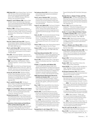 CBRE Global. 2014. Genesis Research Report: Fast Forward 2030: The Future of Work and the Workplace. Beijing. www.cbre.com/o/international/AssetLibrary/CBRE_ Genesis_FAST_FORWARD_Workplace_2030_Exec_ Summary_E.pdf. Accessed15 June 2015. Chappell, D., and V. Di Martino. 2006. Violence at Work. 3rd edition. Geneva: International Labour Organization. www.ilo.org/wcmsp5/groups/public/@dgreports/@dcomm /@publ/documents/publication/wcms_publ_9221108406_ en.pdf. Accessed 6 August 2015. Charmes, J. 2006. “A Review of Empirical Evidence on Time Use in Africa from UN-Sponsored Surveys.” In C.M. Blackden and Q. Wodon, Gender, Time Use, and Poverty in Sub-Saharan Africa. Working Paper 73. Washington, DC: World Bank. ———. 2015. “Time Use across the World: Findings of a World Compilation of Time-Use Surveys.” Working Paper. UNDP–HDRO, New York. Chen, M., C. Bonner, and F. Carré. 2015. “Organizing Informal Workers: Benefits, Challenges and Successes.” Background think piece for Human Development Report 2015. UNDP–HDRO, New York. Choi, H., and H. Varian. 2009. “Predicting Initial Claims for Unemployment Benefits: Technical Report.” Research at Google. http://research.google.com/archive/papers/ initialclaimsUS.pdf. Cisco. 2015. “VNI Forecast Highlights.” www.cisco.com/ web/solutions/sp/vni/vni_forecast_highlights/index.html. Accessed 15 June 2015. Clark, A.E., E. Diener, Y. Georgellis, and R. Lucas. 2008. “Lags and Leads in Life Satisfaction: A Test of the Baseline Hypothesis.” Economic Journal, 118(529): F222–F243. Clark, L. 2013. “How the Red Cross and Digital Volunteers are Mapping Typhoon Haiyan to Save Lives.” Wired, 14 November. www.wired.co.uk/news/archive/2013-11/14/ red-cross-typhoon-philippines. Accessed 4 May 2015. Coenen, M., and R. Kok. 2014. “Workplace Flexibility and New Product Development Performance: The Role of Telework and Flexible Work Schedules.” European Management Journal 32(4): 564–76. www.sciencedirect. com/science/journal/02632373/32/4. Accessed 4 September 2015. Cole, S., and A.N. Fernando. 2012. “The Value of Advice: Evidence from Mobile Phone-based Agricultural Extension.” Finance Working Paper 13-047. Harvard Business School, Cambridge, MA. Colombo, F., A. Llena-Nozal, J. Mercier, and F. Tjadens. 2015. Help Wanted? Providing and Paying for Long-term Care. Paris. www.oecd.org/els/health-systems/help -wanted.htm. Accessed 8 June 2015. Columbia University. 2013. “Council of Malawi to Launch Clinical Mentorship Initiative.” http://icap.columbia.edu/ news-events/detail/icap-supports-the-nurses-and-midwives -council-of-malawi-to-launch-clinical. Accessed 27 May 2015. Confederation of Indian Industry and India Ministry of New and Renewable Energy. 2010. “Human Resource Development Strategies for Indian Renewable Energy Sector.” Hyderabad, India. http://mnre.gov.in/ file-manager/UserFiles/MNRE_HRD_Report.pdf. Accessed 20 July 2015.