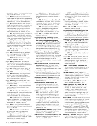 IUES (Institute for Urban and Environmental Studies) and CASS (Chinese Academy of Social Sciences). 2010. “Study on Low Carbon Development and Green Employment in China.” Beijing. Jacobs, E. 2014. “Women Earn Less than Men Even When They Set the Pay.” Financial Times, 6 November. www. ft.com/cms/s/0/79a98b40-59d6-11e4-9787-00144feab 7de.html. Accessed 27 June 2015. ———. 2015a. “Workers of the Gig Economy.” Financial Times, 13 March. ———. 2015b. “Working Older.” Financial Times, 3 July. Jahan, S. 2005. “Reorienting Development: Towards an Engendered Employment Strategy.” Working Paper 5. United Nations Development Programme, International Poverty Centre, Brasilia. Jana, S., B. Dey, S. Reza-Paul, and R. Steen. 2014. “Combatting Human Trafficking in the Sex Trade: Can Sex Workers Do It Better?” Journal of Public Health 36(4): 622–28. The Japan Times. 2015. “Seniors Grow to 26% of Population as Japan Shrinks for Fourth Year Straight.” 17 April. www.japantimes.co.jp/news/2015/04/17/national/ seniors-grow-26-population-japan-shrinks-fourth-year -straight/. Accessed 23 July 2015. Jaumotte, F., and C. Buitron. 2015. “Power from the People.” Finance & Development 52(1): 29–31. Jiménez Cisneros, B.E., Oki, T., Arnell, N.W., and others. 2014. “Freshwater Resources.” In C.B. Field, V.R. Barros, D.J. Dokken, and others, eds., Climate Change 2014: Impacts, Adaptation, and Vulnerability. Part A: Global and Sectoral Aspects. Contribution of Working Group II to the Fifth Assessment Report of the Intergovernmental Panel on Climate Change. New York: Cambridge University Press. Kabanda, P. 2015. “Work as Art: How the Linkages between Creative Work and Human Development Flow: Analytical Paper on the Linkages between Creative Work and Human Development.” Background think piece for Human Development Report 2015. UNDP–HDRO, New York.