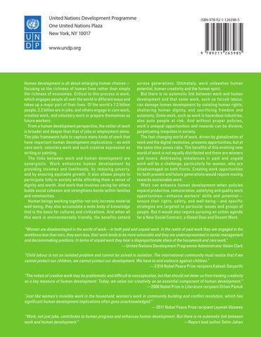 ”Women are disadvantaged in the world of work—in both paid and unpaid work. In the realm of paid work they are engaged in the workforce less than men, they earn less, their work tends to be more vulnerable and they are underrepresented in senior management and decisionmaking positions. In terms of unpaid work they bear a disproportionate share of the housework and care work." —United Nations Development Programme Administrator Helen Clark “Child labour is not an isolated problem and cannot be solved in isolation. The international community must realize that if we cannot protect our children, we cannot protect our development. We have to end violence against children.” —2 014 Nobel Peace Prize recipient Kailash Satyarthi “The notion of creative work may be problematic and difficult to conceptualize, but that should not deter us from treating creativity as a key measure of human development. Today, we value our creativity as an essential component of human development.” —2006 Nobel Prize in Literature recipient Orhan Pamuk “Just like women’s invisible work in the household, women’s work in community building and conflict resolution, which has significant human development implications often goes unacknowledged.” —2011 Nobel Peace Prize recipient Leymah Gbowee “Work, not just jobs, contributes to human progress and enhances human development. But there is no automatic link between work and human development.” —Report lead author Selim Jahan