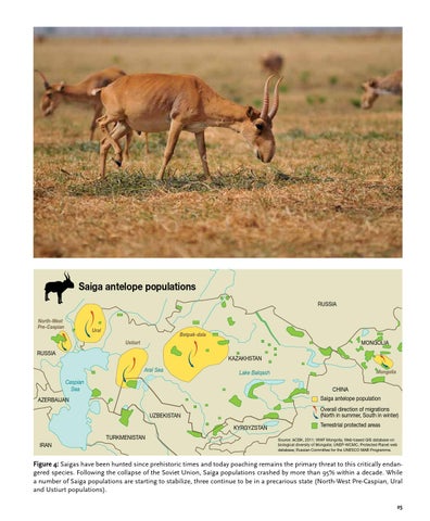 Figure 4: Saigas have been hunted since prehistoric times and today poaching remains the primary threat to this critically endangered species. Following the collapse of the Soviet Union, Saiga populations crashed by more than 95% within a decade. While a number of Saiga populations are starting to stabilize, three continue to be in a precarious state (North-West Pre-Caspian, Ural and Ustiurt populations). 25