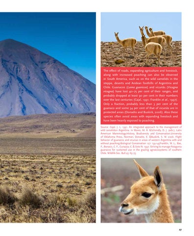 The effect of roads, expanding agriculture and livestock, along with increased poaching can also be observed in South America, such as on the wild camelids in the steppe, deserts and Andean foothills of Argentina and Chile. Guanacos (Lama guanicoe) and vicunãs (Vicugna vicugna) have lost 40–75 per cent of their ranges, and probably dropped at least 90 per cent in their numbers over the last centuries (Cajal, 1991; Franklin et al., 1997). Only a fraction, probably less than 3 per cent of the guanaco and some 34 per cent of that of vicunãs are in protected areas (Donadio and Buskirk, 2006). Also these species often avoid areas with expanding livestock and have been heavily exposed to poaching. Source: Cajal, J. L. 1991. An integrated approach to the management of wild camelidsin Argentina. In Mares, M. A. &Schmidly, D. J. (eds.), Latin American Mammology.History, Biodiversity and Conservation.University of Oklahoma Press, Norman; Donadio, E. &Buskirk, S. W. 2006. Flight behavior of guanacos and vicunas in areas of western Argentina with and without poaching.Biological Conservation 127: 139-145Franklin, W. L., Bas, F., Bonacic, C. F., Cunazza, C. & Soto N. 1997. Striving to manage Patagonia guanacos for sustained use in the grazing agroecosystems of southern Chile. Wildlife Soc. Bull.25: 65–73