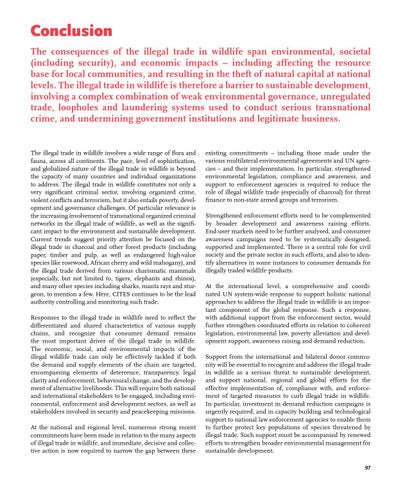 Conclusion The consequences of the illegal trade in wildlife span environmental, societal (including security), and economic impacts – including affecting the resource base for local communities, and resulting in the theft of natural capital at national levels. The illegal trade in wildlife is therefore a barrier to sustainable development, involving a complex combination of weak environmental governance, unregulated trade, loopholes and laundering systems used to conduct serious transnational crime, and undermining government institutions and legitimate business.