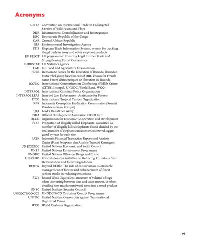 Acronyms CITES Convention on International Trade in Endangered Species of Wild Fauna and Flora DDR Disarmament, Demobilization and Reintegration DRC Democratic Republic of the Congo CAR Central African Republic EIA Environmental Investigation Agency ETIS Elephant Trade Information System, system for tracking illegal trade in ivory and other elephant products EU FLEGT EU programme: Ensuring Legal Timber Trade and Strengthening Forest Governance EUROSTAT EU Statistics agency FAO UN Food and Agriculture Organization FDLR Democratic Forces for the Liberation of Rwanda, Rwandan Hutu rebel group based in east of DRC known for French name Forces démocratiques de libération du Rwanda ICCWC International Consortium on Combating Wildlife Crime (CITES, Interpol, UNODC, World Bank, WCO) INTERPOL International Criminal Police Organization INTERPOL LEAF Interpol Law Enforcement Assistance for Forests ITTO International Tropical Timber Organization KPK Indonesia Corruption Eradication Commission (Komisi Pemberantasan Korupsi) LRA Lord’s Resistance Army ODA Official Development Assistance, OECD term OECD Organisation for Economic Co-operation and Development PIKE Proportion of Illegally Killed Elephants, calculated as number of illegally killed elephants found divided by the total number of elephant carcasses encountered, aggregated by year for each site PATK Indonesia Financial Transaction Reports and Analysis Center (Pusat Pelaporan dan Analisis Transaki Keuangan) UN ECOSOC United Nations Economic and Social Council UNEP United Nations Environment Programme UNODC United Nations Office on Drugs and Crime UN-REDD UN collaborative initiative on Reducing Emissions from Deforestation and forest Degradation REDD+ Beyond REDD: The role of conservation, sustainable management of forests and enhancement of forest carbon stocks in reducing emissions RWE Round Wood Equivalent, measure of volume of logs when converting between tons and cubic meters, or when detailing how much roundwood went into a wood product UNSC United Nations Security Council UNODC-WCO CCP UNODC-WCO Container Control Programme UNTOC United Nations Convention against Transnational Organized Crime WCO World Customs Organization