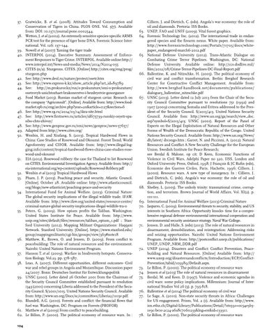 Cilliers, J. and Dietrich, C. (eds). Angola’s war economy: the role of oil and diamonds. Pretoria: ISS Books. 63. UNEP, FAO and UNFF (2009). Vital forest graphics. 64. Forensic Technology Inc. (2012). The international trade in endangered species and the firearm nexus. White paper. Available from: http://www.forensictechnology.com/Portals/71705/docs/whitepaper_endangered-march6-2012.pdf 65. National Defense University (2012). Trans-Atlantic Dialogue on Combating Crime Terror Pipelines. Washington, DC: National Defense University. Available online: http://cco.dodlive.mil/ files/2012/08/Crime-Terror-Pipelines-DC-Final-Report.pdf 66. Ballentine, K. and Nitzschke, H. (2005). The political economy of civil war and conflict transformation. Berlin: Berghof Research Center for Constructive Conflict Management. Available from: http://www.berghof-handbook.net/documents/publications/ dialogue3_ballentine_nitzschke.pdf 67. UNSC (2013). Letter dated 12 July 2013 from the Chair of the Security Council Committee pursuant to resolutions 751 (1992) and 1907 (2009) concerning Somalia and Eritrea addressed to the President of the Security Council. S/2013/413. United Nations Security Council. Available fom: http://www.un.org/ga/search/view_doc. asp?symbol=S/2013/413; UNSC (2001). Report of the Panel of Experts on the Illegal Exploitation of Natural Resources and Other Forms of Wealth of the Democratic Republic of the Congo. United Nations Security Council. Available from: http://www.un.org/News/ dh/latest/ drcongo.htm ; Garret, N. and Piccinni, A. (2012). Natural Resources and Conflict A New Security Challenge for the European Union. Swedish Institute for Peace Research; see Berdal & Malone, op cit; D Keen, Economic Functions of Violence in Civil Wars, Adelphi Paper no 320, IISS, London and Oxford University Press, Oxford, 1998; J François & JC Rufin (eds), Economie des Guerres Civiles, Paris, Hachette, 1996; Cilliers, J. (2000). Resource wars. A new type of insurgency. In : Cilliers, J. and Dietrich, C. (eds). Angola’s war economy: the role of oil and diamonds. Pretoria: ISS Books. 68. Shelley, L. (2005). The unholy trinity: transnational crime, corruption, and terrorism. Brown Journal of World Affairs, Vol. XI(2). p. 101-111. 69. International Fund for Animal Welfare (2013) Criminal Nature 70. Jasparro, C. (2009). Environmental threats to security, stability, and US interests in Southern Africa: Opportunity knocks- time for a comprehensive regional defense environmental international cooperation and environmental security assistance strategy. Naval War College. 71. Jensen. D. and Halle, S. (eds) (2013). The role of natural resources in disarmament, demobilization, and reintegration: Addressing risks and seizing opportunities. Nairobi: United Nations Environment Program. Available from: http://postconflict.unep.ch/publications/ UNEP_UNDP_NRM_DDR.pdf 72. UNEP (2014). Disasters and Conflict: Conflict Prevention, Peacebuilding and Natural Resources. [Online] Available from: http:// www.unep.org/disastersandconflicts/Introduction/ECP/ConflictPrevention/tabid/105989/Default.aspx. 73. Le Billon, P. (2000). The political economy of resource wars 74. Jensen et al (2013) The role of natural resources in disarmament 75. Berdal, M. and Keen. D. (1997). Violence and economic agendas in civil wars: some policy implications. Millennium: Journal of International Studies Vol 26 (3). p. 795-818. 76. Ballentine et al (2014) The political economy of civil war 77. Le Sage, A. (2010). Non-state security threats in Africa: Challenges for US engagement. Prism, Vol. 2 (1). Available from: http://www. isn.ethz.ch/Digital-Library/Publications/Detail/?ots591=0c54e3b31e9c-be1e-2c24-a6a8c7060233&lng=en&id=133911. 78. Le Billon, P. (2000). The political economy of resource wars