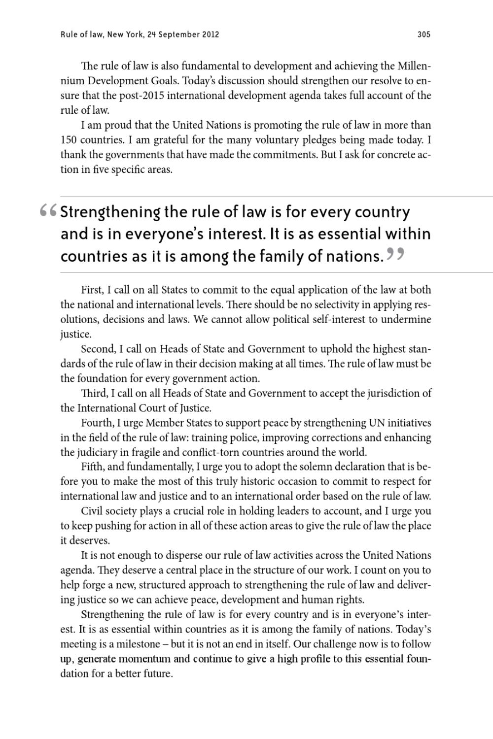 The rule of law is also fundamental to development and achieving the Millennium Development Goals. Today’s discussion should strengthen our resolve to ensure that the post-2015 international development agenda takes full account of the rule of law. I am proud that the United Nations is promoting the rule of law in more than 150 countries. I am grateful for the many voluntary pledges being made today. I thank the governments that have made the commitments. But I ask for concrete action in five specific areas.