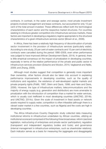contracts. In contrast, in the water and sewage sector, most private investment projects involved management and lease contracts, but accounted for only 15 per cent of the total amount invested. These differences reflect both the technological characteristics of each sector and the respective market structures. For countries seeking to introduce greater competition into infrastructure services markets, these factors are important in developing a regulatory regime appropriate to the structural characteristics of a given infrastructure services sector (Brown et al., 2006). In Africa, there has been a relatively high frequency of discontinuation of private sector involvement in the provision of infrastructure services (particularly water). According to one study, 25 per cent of water contracts and 15 per cent of electricity contracts were cancelled during the period 1990–2009, even when performance was judged to have improved (African Development Bank, 2014). In general, there is little empirical consensus on the impact of privatization in developing countries, especially in terms of the relative performance of the private and public sector in infrastructure services provision (Estache and Wodon, 2014; Vagliasindi and Nellis, 2009; and Zhang, 2006). Although most studies suggest that competition is generally more important than ownership, other factors should also be taken into account in explaining performance improvements in developing countries, such as the quality of institutions and regulation, the existence of well-developed capital markets and private property rights (Pollitt, 1997; Stern and Davis, 1998; and Hare and Davis, 2006). However, the type of infrastructure matters; telecommunications and the majority of energy supply (e.g. generation and distribution) are more amenable to privatization with the introduction of competition than a market for water services, which is usually cost inefficient in most developing countries (UNCTAD, 2014b; and UNCTAD, 2014c). Given the scale of investment in fixed assets or network assets required to supply water, competition is often infeasible (although there is a vibrant water market in a few countries, such as Nigeria) and the costs are high in developing countries. The Africa Infrastructure Country Diagnostic study collected data measuring institutional reforms in infrastructure undertaken by African countries, utilizing an institutional scorecard comprised of the following three broad areas: reform (sectoral legislation, restructuring of enterprises and private sector participation); regulation (transparent and independent regulatory bodies and tools); and governance (internal management in infrastructure enterprises, such as shareholder relations). Each indicator serves as a basis for measuring the (aggregate and disaggregate)