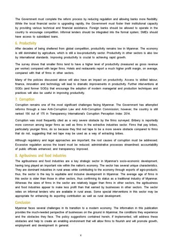 Conclusion Myanmar faces several challenges in its transition to a modern economy. The information in this publication provides the much-needed perspective of businesses on the ground in Myanmar, the conditions they experience and the obstacles they face. The policy suggestions contained herein, if implemented, will address these obstacles and help to create an enabling environment that will allow firms to flourish and will promote growth, employment and development in general. x