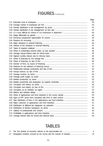 FIGURES (continued) Page 3.37 Education level of employees ............................................................................................................................... 42 3.38 Average number of employees per firm ........................................................................................................... 42 3.39 Gender distribution in top management, by sector ....................................................................................... 43 3.40 Gender distribution in top management, by firm size ................................................................................ 43 3.41 Is it more difficult for women to run businesses in Myanmar? ............................................................... 44 3.42 Wage differential, by gender ................................................................................................................................ 44 3.43 Perceived employment opportunities for women ............................................................................................ 45 3.44 Reasons for borrowing ............................................................................................................................................ 45 3.45 Major obstacles to external financing ................................................................................................................ 46 3.46 Indexes of the obstacles to external financing ............................................................................................... 47 3.47 Types of required collateral ................................................................................................................................... 48 3.48 Share of outstanding external debts, by loan duration ............................................................................... 48 3.49 Average annual interest rates for formal loans ............................................................................................. 49 3.50 Highest monthly interest rate for informal loans ........................................................................................... 49 3.51 Share of financing for the average firm .......................................................................................................... 50 3.52 Share of financing, by size of firm .................................................................................................................... 50 3.53 Number of firms, by source of financing ........................................................................................................ 51 3.54 Reasons for the selection of financing source .............................................................................................. 51 3.55 Relationship between productivity and size of firm ..................................................................................... 52 3.56 Annual revenue, by size of firm ......................................................................................................................... 53 3.57 Average revenue, by sector .................................................................................................................................. 54 3.58 Average profit margin, by sector ........................................................................................................................ 54 3.59 Median productivity, by sector .............................................................................................................................. 55 3.60 Median productivity and employees, by majority ownership ...................................................................... 55 3.61 Corruption and bribery, by sector ....................................................................................................................... 56 3.62 Corruption and bribery, by size of firm ............................................................................................................ 57 3.63 Corruption as an obstacle, by region ............................................................................................................... 57 3.64 Bribery and obstacle ratings ................................................................................................................................. 58 3.65 Share of agribusiness and food industries in the survey sample .......................................................... 59 3.66 Ages of AFF sector firms compared with firms in other sectors ........................................................... 60 3.67 Size distribution of firms in the agribusiness and food industries .......................................................... 60 3.68 Major customers of agribusiness and food industries ................................................................................. 61 3.69 Distribution of different job categories, by subsector ................................................................................... 61 3.70 Distribution of full-time employees, by sector ................................................................................................. 62 3.71 Salaries of professionals and workers .............................................................................................................. 62 3.72 Profitability in agribusiness and food industries ............................................................................................. 63 3.73 Average interest rates for formal and informal loans .................................................................................. 63