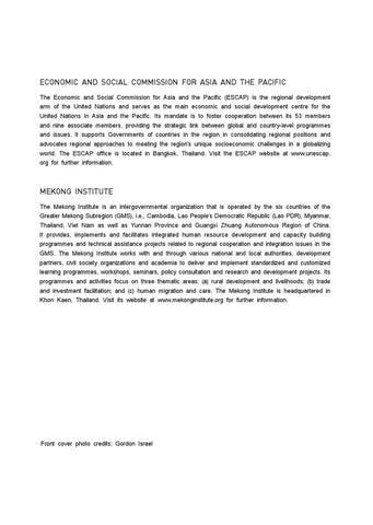 Mekong Institute The Mekong Institute is an intergovernmental organization that is operated by the six countries of the Greater Mekong Subregion (GMS), i.e., Cambodia, Lao People’s Democratic Republic (Lao PDR), Myanmar, Thailand, Viet Nam as well as Yunnan Province and Guangxi Zhuang Autonomous Region of China. It provides, implements and facilitates integrated human resource development and capacity building programmes and technical assistance projects related to regional cooperation and integration issues in the GMS. The Mekong Institute works with and through various national and local authorities, development partners, civil society organizations and academia to deliver and implement standardized and customized learning programmes, workshops, seminars, policy consultation and research and development projects. Its programmes and activities focus on three thematic areas: (a) rural development and livelihoods; (b) trade and investment facilitation; and (c) human migration and care. The Mekong Institute is headquartered in Khon Kaen, Thailand. Visit its website at www.mekonginstitute.org for further information.