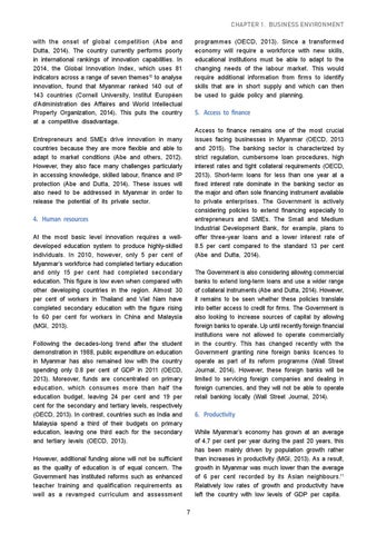 with the onset of global competition (Abe and Dutta, 2014). The country currently performs poorly in international rankings of innovation capabilities. In 2014, the Global Innovation Index, which uses 81 indicators across a range of seven themes10 to analyse innovation, found that Myanmar ranked 140 out of 143 countries (Cornell University, Institut Européen d’Administration des Affaires and World Intellectual Property Organization, 2014). This puts the country at a competitive disadvantage.