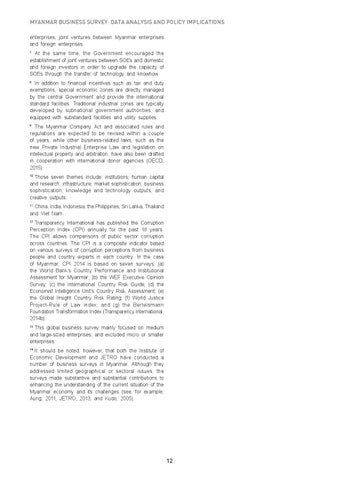 It should be noted, however, that both the Institute of Economic Development and JETRO have conducted a number of business surveys in Myanmar. Although they addressed limited geographical or sectoral issues, the surveys made substantive and substantial contributions to enhancing the understanding of the current situation of the Myanmar economy and its challenges (see, for example, Aung, 2011; JETRO, 2013; and Kudo, 2005). 14