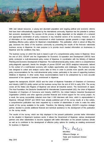 With vast natural resources, a young and abundant population and ongoing political and economic reforms that have been enthusiastically supported by the international community, Myanmar has the potential to achieve fast economic development. The success of this process is highly dependent on the adoption of a coherent and appropriate combination of policy measures in key industrial sectors of its economy. However, a lack of information on the conditions and environment in which businesses operate presents a major obstacle in identifying effective policy options for Myanmar’s industrialization. This publication, which is aimed at filling this gap, assesses the status of the business community by presenting the results of the first-ever nationwide business survey in Myanmar. Its main purpose is to provide much needed information on businesses in Myanmar and the conditions they face. The business survey on which this book is based is part of a comprehensive policy review in Myanmar. Since the end of 2012, ESCAP and the Organisation for Economic Co-operation and Development (OECD) have jointly conducted a multi-dimensional policy review of Myanmar, in coordination with the Ministry of National Planning and Economic Development of Myanmar. The multi-dimensional policy review, which is a comprehensive policy-diagnostic approach, blends the strengths of proven ESCAP and OECD analytical instruments, tailored to the context of a multi-faceted economy with multiple opportunities and challenges. The business survey was designed to collect and analyse scarce data on firms in order to provide more specific and concrete policy recommendations for the multi-dimensional policy review, particularly in the area of supporting business initiatives in Myanmar. In other words, these recommendations need to be underpinned by a more accurate assessment of the dynamic business environment in Myanmar. Against this background, ESCAP, OECD and the Union of Myanmar Federation of Chambers of Commerce and Industry (UMFCCI) jointly carried out this business survey from the end of 2013 to early 2014. The survey covers all the States and Regions of Myanmar and almost all industrial sectors. The Government of Japan, The Asia Foundation, the Deutsche Gesellschaft für Internationale Zusammenarbeit (GIZ), the Union of Myanmar Federation of Chambers of Commerce and Industry (UMFCCI), the United Nations Industrial Development Organization (UNIDO) and other agencies provided financial and in-kind support for the survey project. As a result, the survey successfully collected more than 3 000 interviews with firms, which is unprecedented in Myanmar. Although ESCAP and OECD have already published part of the survey results at a few outlets, a comprehensive publication has been requested by a number of stakeholders in order to make the entire results of the survey available to the public. Therefore, the Mekong Institute, ESCAP’s long-time strategic partner, decided to provide additional financial and technical assistance to the development of this publication on the survey results. The results of the survey, which are fully displayed in the present publication, provide better information on the situation in Myanmar’s business sector. It allows the Government of Myanmar, various development partners and other stakeholders to become equipped with better information on the present business climate as well as to contribute to the development of effective policy options for creating an enabling environment for business in Myanmar.