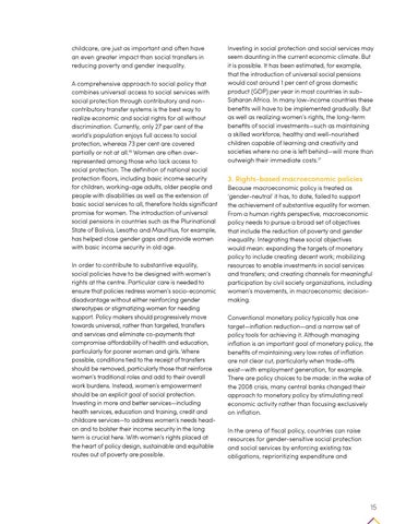 childcare, are just as important and often have an even greater impact than social transfers in reducing poverty and gender inequality. A comprehensive approach to social policy that combines universal access to social services with social protection through contributory and noncontributory transfer systems is the best way to realize economic and social rights for all without discrimination. Currently, only 27 per cent of the world’s population enjoys full access to social protection, whereas 73 per cent are covered partially or not at all.16 Women are often overrepresented among those who lack access to social protection. The definition of national social protection floors, including basic income security for children, working-age adults, older people and people with disabilities as well as the extension of basic social services to all, therefore holds significant promise for women. The introduction of universal social pensions in countries such as the Plurinational State of Bolivia, Lesotho and Mauritius, for example, has helped close gender gaps and provide women with basic income security in old age. In order to contribute to substantive equality, social policies have to be designed with women’s rights at the centre. Particular care is needed to ensure that policies redress women’s socio-economic disadvantage without either reinforcing gender stereotypes or stigmatizing women for needing support. Policy makers should progressively move towards universal, rather than targeted, transfers and services and eliminate co-payments that compromise affordability of health and education, particularly for poorer women and girls. Where possible, conditions tied to the receipt of transfers should be removed, particularly those that reinforce women’s traditional roles and add to their overall work burdens. Instead, women’s empowerment should be an explicit goal of social protection. Investing in more and better services—including health services, education and training, credit and childcare services—to address women’s needs headon and to bolster their income security in the long term is crucial here. With women’s rights placed at the heart of policy design, sustainable and equitable routes out of poverty are possible.