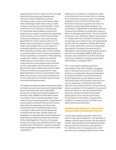 Global policy coordination is essential to create a macroeconomic environment that is conducive to the realization of women’s rights. The growing integration of the world’s economies means that actions taken by one government affect the realization of rights elsewhere. Moreover, the proliferation of agreements to liberalize trade and financial flows between countries limits the policy space of individual governments. The lack of global coordination also affects the ability of governments to mobilize resources. Multinational corporations, for example, use a variety of accounting techniques to lower their tax obligations, thereby diminishing their overall contribution to the economies where they operate. Estimates of tax revenue lost to developing countries due to trade mispricing alone amount to an estimated US$98 to $106 billion per year, nearly $20 billion more than the annual capital costs needed to achieve universal water and sanitation coverage by 2015.19 The current system of global governance exacerbates, rather than mitigates, the gender bias in macroeconomic policy. In most existing institutions, including the International Monetary Fund, the World Bank, the G20 and the World Trade Organization, power relations are such that governments of the poorest countries do not have an equal say in the decisions that affect them the most, let alone women in those countries. Global cooperation for the realization of economic and social rights can only be achieved if these institutions are democratized and powerful global players, from national governments to transnational corporations, accept that the obligation to respect, protect and fulfil human rights extends beyond borders.