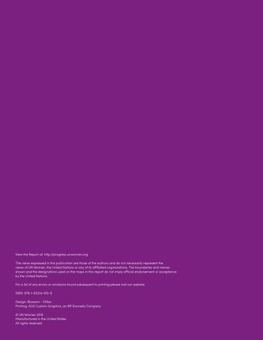 View the Report at: http://progress.unwomen.org The views expressed in this publication are those of the authors and do not necessarily represent the views of UN Women, the United Nations or any of its affiliated organizations. The boundaries and names shown and the designations used on the maps in this report do not imply official endorsement or acceptance by the United Nations. For a list of any errors or omissions found subsequent to printing please visit our website. ISBN: 978-1-63214-015-9 Design: Blossom - Milan Printing: AGS Custom Graphics, an RR Donnelly Company Š UN Women 2015 Manufactured in the United States All rights reserved
