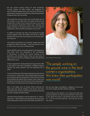 the only woman serving among 24 other secretaries. Through Chapéu de Palha Mulher, she integrated the work of different departments and more than 40 women’s organizations, helping to strengthen the relationship between the government and civil society. “We wanted the women to learn how to take better care of their bodies, so we called upon the health secretariat. We wanted them to learn how to read and write, so we called on the education secretariat,” Cristina says. “However, the people working on the ground were in the local women’s organizations. We knew their participation was crucial.” In addition to learning new skills, the programme brought women together. Many, like Angela, who chose to identify herself by first name only, found a sense of community within the classroom. “My husband would beat me constantly,” Angela says, who escaped her abusive marriage. “I never had anyone to turn to. Now I know I can count on these women.” Nearly 100,000 women have participated in the programme since 2007, which has expanded to 89 municipalities in Pernambuco to include rural women working in fruit plantations and artisanal fishing. There are also plans to open a school in the town of Pesqueira, where courses will be offered year-round. Cristina resigned from the Secretariat last August shortly after a fatal plane crash killed presidential candidate Eduardo Campos, the former governor who first appointed her to office. “I’m proud of the work I did in the secretariat, but it was time for me to move on,” Cristina says. She is hopeful that the work will be continued under the new governor, Paulo Câmara and the new Secretaria da Mulher, Silvia Cordeiro. Silvia comes to the Secretariat having led one of the local women’s organizations that has been so instrumental to the programme’s success. Back in the sleepy town of Escada, Maria examines the water valve she recently installed in her shower. Her home has become the canvas on which she practices the skills she learned in Chapéu de Palha Mulher. “We were having problems with the electricity, so I fixed it,” Maria says. “I also worked on the plumbing. My next project will be laying down ceramic tile in the kitchen and bathroom.”