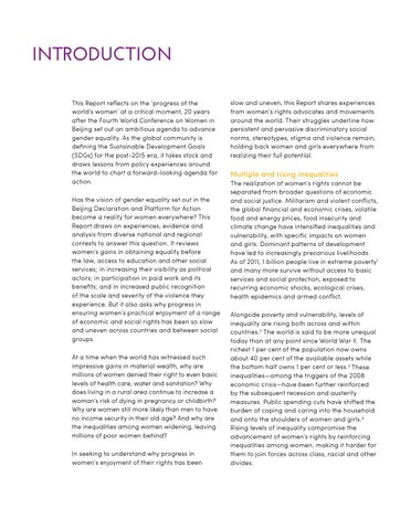 INTRODUCTION This Report reflects on the ‘progress of the world’s women’ at a critical moment, 20 years after the Fourth World Conference on Women in Beijing set out an ambitious agenda to advance gender equality. As the global community is defining the Sustainable Development Goals (SDGs) for the post-2015 era, it takes stock and draws lessons from policy experiences around the world to chart a forward-looking agenda for action. Has the vision of gender equality set out in the Beijing Declaration and Platform for Action become a reality for women everywhere? This Report draws on experiences, evidence and analysis from diverse national and regional contexts to answer this question. It reviews women’s gains in obtaining equality before the law, access to education and other social services; in increasing their visibility as political actors; in participation in paid work and its benefits; and in increased public recognition of the scale and severity of the violence they experience. But it also asks why progress in ensuring women’s practical enjoyment of a range of economic and social rights has been so slow and uneven across countries and between social groups. At a time when the world has witnessed such impressive gains in material wealth, why are millions of women denied their right to even basic levels of health care, water and sanitation? Why does living in a rural area continue to increase a woman’s risk of dying in pregnancy or childbirth? Why are women still more likely than men to have no income security in their old age? And why are the inequalities among women widening, leaving millions of poor women behind? In seeking to understand why progress in women’s enjoyment of their rights has been