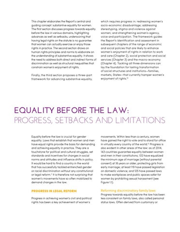 EQUALITY BEFORE THE LAW: PROGRESS, SETBACKS AND LIMITATIONS Equality before the law is crucial for gender equality. Laws that establish that women and men have equal rights provide the basis for demanding and achieving equality in practice. They are a touchstone for political and cultural struggles, set standards and incentives for changes in social norms and attitudes and influence shifts in policy. It would be hard to find a country in the world that has successfully tackled entrenched gender or racial discrimination without any constitutional or legal reform.11 It is therefore not surprising that women’s movements have so often mobilized to demand changes in the law.