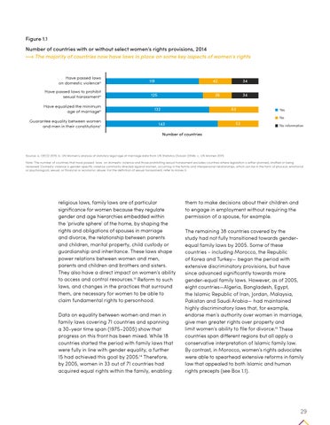 religious laws, family laws are of particular significance for women because they regulate gender and age hierarchies embedded within the ‘private sphere’ of the home, by shaping the rights and obligations of spouses in marriage and divorce, the relationship between parents and children, marital property, child custody or guardianship and inheritance. These laws shape power relations between women and men, parents and children and brothers and sisters. They also have a direct impact on women’s ability to access and control resources.13 Reform to such laws, and changes in the practices that surround them, are necessary for women to be able to claim fundamental rights to personhood. Data on equality between women and men in family laws covering 71 countries and spanning a 30-year time span (1975–2005) show that progress on this front has been mixed. While 18 countries started the period with family laws that were fully in line with gender equality, a further 15 had achieved this goal by 2005.14 Therefore, by 2005, women in 33 out of 71 countries had acquired equal rights within the family, enabling