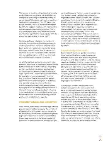 The number of countries with policies that formally entrench sex discrimination in the workplace—for example, by prohibiting women from working in certain types of jobs, doing night work or overtime— declined during this period.23 In 1975, it was most typical not to take action to outlaw discrimination. By 2005, the opposite was true, with most countries outlawing workplace discrimination (see Figure 1.3). For example, in 1975 only about one third of countries had legislated for equal pay; by 2005 the proportion had gone up to 86 per cent.24 Similarly, as Figure 1.3 shows, the number of countries that provide paid maternity leave to working women has increased and there has been a dramatic expansion in parental leave. Moreover, by 2005, more than 81 per cent of countries out of the 70 studied had a national day-care policy in place and 43 per cent had committed to public day-care provision.25 As with family laws, women’s movements have played a pivotal role in pushing for women’s legal rights to work and at work. Women’s organizing on their own behalf has played a critical part in triggering changes with respect to women’s legal right to work—by prohibiting discrimination, for example, or promoting equality in hiring and promotion. Overall income levels were a significant factor for the adoption of maternity and parental leave provisions: without an adequate revenue base, countries are unlikely to adopt publicly-funded paid maternity leave.26 Women’s movements have also been influential in the development of childcare policy and have found useful allies on this issue among political parties with a redistributive agenda.