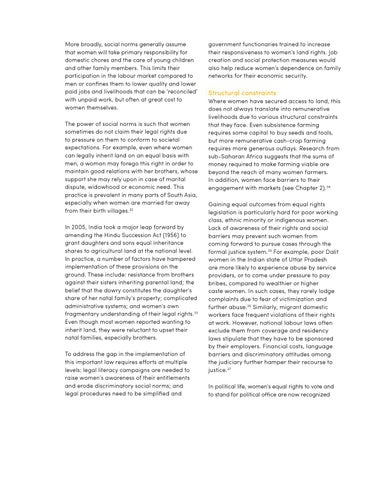 More broadly, social norms generally assume that women will take primary responsibility for domestic chores and the care of young children and other family members. This limits their participation in the labour market compared to men or confines them to lower quality and lower paid jobs and livelihoods that can be ‘reconciled’ with unpaid work, but often at great cost to women themselves. The power of social norms is such that women sometimes do not claim their legal rights due to pressure on them to conform to societal expectations. For example, even where women can legally inherit land on an equal basis with men, a woman may forego this right in order to maintain good relations with her brothers, whose support she may rely upon in case of marital dispute, widowhood or economic need. This practice is prevalent in many parts of South Asia, especially when women are married far away from their birth villages.32 In 2005, India took a major leap forward by amending the Hindu Succession Act (1956) to grant daughters and sons equal inheritance shares to agricultural land at the national level. In practice, a number of factors have hampered implementation of these provisions on the ground. These include: resistance from brothers against their sisters inheriting parental land; the belief that the dowry constitutes the daughter’s share of her natal family’s property; complicated administrative systems; and women’s own fragmentary understanding of their legal rights.33 Even though most women reported wanting to inherit land, they were reluctant to upset their natal families, especially brothers. To address the gap in the implementation of this important law requires efforts at multiple levels: legal literacy campaigns are needed to raise women’s awareness of their entitlements and erode discriminatory social norms; and legal procedures need to be simplified and