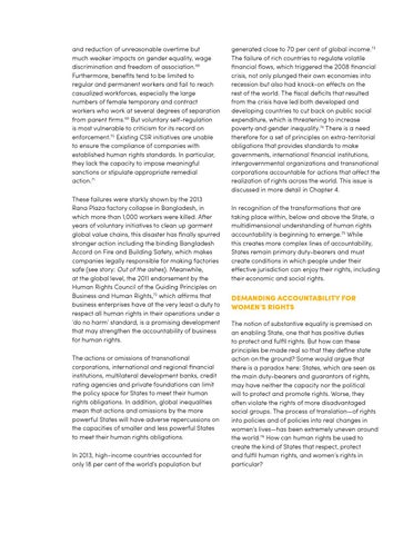 and reduction of unreasonable overtime but much weaker impacts on gender equality, wage discrimination and freedom of association.68 Furthermore, benefits tend to be limited to regular and permanent workers and fail to reach casualized workforces, especially the large numbers of female temporary and contract workers who work at several degrees of separation from parent firms.69 But voluntary self-regulation is most vulnerable to criticism for its record on enforcement.70 Existing CSR initiatives are unable to ensure the compliance of companies with established human rights standards. In particular, they lack the capacity to impose meaningful sanctions or stipulate appropriate remedial action.71 These failures were starkly shown by the 2013 Rana Plaza factory collapse in Bangladesh, in which more than 1,000 workers were killed. After years of voluntary initiatives to clean up garment global value chains, this disaster has finally spurred stronger action including the binding Bangladesh Accord on Fire and Building Safety, which makes companies legally responsible for making factories safe (see story: Out of the ashes). Meanwhile, at the global level, the 2011 endorsement by the Human Rights Council of the Guiding Principles on Business and Human Rights,72 which affirms that business enterprises have at the very least a duty to respect all human rights in their operations under a ‘do no harm’ standard, is a promising development that may strengthen the accountability of business for human rights. The actions or omissions of transnational corporations, international and regional financial institutions, multilateral development banks, credit rating agencies and private foundations can limit the policy space for States to meet their human rights obligations. In addition, global inequalities mean that actions and omissions by the more powerful States will have adverse repercussions on the capacities of smaller and less powerful States to meet their human rights obligations. In 2013, high-income countries accounted for only 18 per cent of the world’s population but