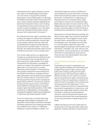 and political rights are critical if conditions for accountability are to exist and flourish.81 But even where national political systems are not formally democratic, localized forms of organizing can take place around, for example, labour rights, social rights or women’s civil and political rights. Rights advocacy does not have to wait for a fullyfledged democratic regime to emerge. In fact, the process of claiming rights can itself contribute to building state accountability for women’s rights.82 Second, even in formally democratic settings, the idea of human rights may not be enthusiastically embraced by all. The struggle for human rights has often had to contend with two critical sets of challenges: one is that States may have little or no accountability, especially to poor and disadvantaged social groups; and the other is that inequalities—of gender, race, class, ethnicity and sexual identity—may have become so normalized that they are not perceived as unjust even by those who are most subordinated or who suffer most from discrimination.83