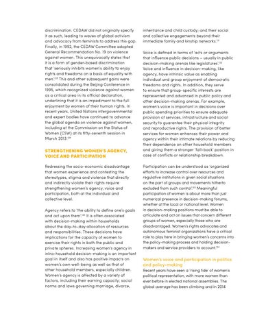 STRENGTHENING WOMEN’S AGENCY, VOICE AND PARTICIPATION Redressing the socio-economic disadvantage that women experience and contesting the stereotypes, stigma and violence that directly and indirectly violate their rights require strengthening women’s agency, voice and participation, both at the individual and collective level. Agency refers to ‘the ability to define one’s goals and act upon them’.130 It is often associated with decision-making within households about the day-to-day allocation of resources and responsibilities. These decisions have implications for the capacity of women to exercise their rights in both the public and private spheres. Increasing women’s agency in intra-household decision-making is an important goal in itself and also has positive impacts on women’s own well-being as well as that of other household members, especially children. Women’s agency is affected by a variety of factors, including their earning capacity; social norms and laws governing marriage, divorce,