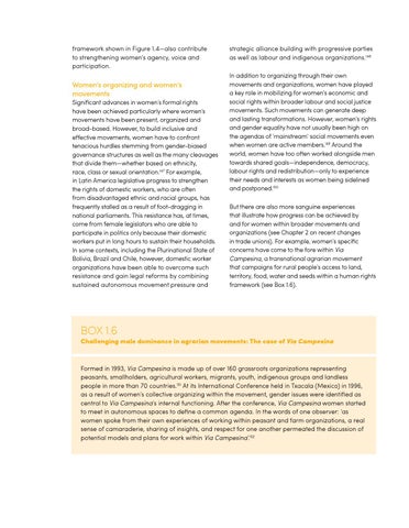 strategic alliance building with progressive parties as well as labour and indigenous organizations.148 In addition to organizing through their own movements and organizations, women have played a key role in mobilizing for women’s economic and social rights within broader labour and social justice movements. Such movements can generate deep and lasting transformations. However, women’s rights and gender equality have not usually been high on the agendas of ‘mainstream’ social movements even when women are active members.149 Around the world, women have too often worked alongside men towards shared goals—independence, democracy, labour rights and redistribution—only to experience their needs and interests as women being sidelined and postponed.150 But there are also more sanguine experiences that illustrate how progress can be achieved by and for women within broader movements and organizations (see Chapter 2 on recent changes in trade unions). For example, women’s specific concerns have come to the fore within Via Campesina, a transnational agrarian movement that campaigns for rural people’s access to land, territory, food, water and seeds within a human rights framework (see Box 1.6).