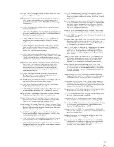 . 2015. “UNECE Statistical Database.” Accessed March 2015. http:// w3.unece.org/pxweb/?lang=1. ECLAC (Economic Commission for Latin America and the Caribbean). 2004. “Poverty and Inequality from a Gender Perspective.” in Social Panorama of Latin America 2003–2003, 133–70. Santiago: United Nations. . 2006. “Social Panorama of Latin America and the Caribbean.” Santiago: United Nations. . 2013. Annual Report 2012 – A Look at Grants, Support and Burden for Women. Gender Equality Observatory of Latin America and the Caribbean Santiago: United Nations. . 2014a. “CEPALSTAT Database.” Accessed January 2015. http:// estadisticas.cepal.org/cepalstat/WEB_CEPALSTAT/Portada. asp?idioma=i. . 2014b. “Programas de Transferencias Condicionadas: Base de Datos de Programas de Protección Social no Contributiva en América Latina y el Caribe.” Santiago: United Nations. Accessed January 2015. http://dds.cepal.org/bdptc/. . 2014c. “Regional Review and Appriasal of Implementation of the Beijing Declaration and Platform for Action and the Outcome of the Twenty-Third Special Session of the General Assembly (2000) in Latin American and Caribbean countries.” Santiago: United Nations. The Economist. 2014a. “Women’s Quotas on Company Boards: Harder than It Looks – Germany’s New Policy May Do Little to Boost Gender Equality in the Workplace.” 12 December. http://www. economist.com/news/business-and-finance/21636284-germanys-new-proposals-risk-damaging-gender-equality-workplace-regulation-too-far. . 2014b. “The Spread of Gender Quotas for Company Boards.” 25 March. http://www.economist.com/blogs/economist-explains/2014/03/economist-explains-14. Eide, A. 1983. “The Right to Adequate Food as a Human Right.” Office of the High Commissioner for Human Rights, Geneva.