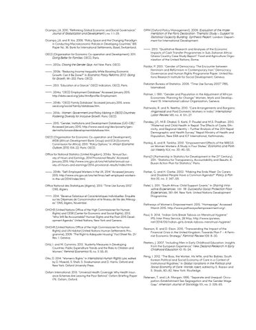 OPM (Oxford Policy Management). 2009. Evaluation of the Implementation of the Paris Declaration: Thematic Study – Support to Statistical Capacity Building, Synthesis Report. London: Department for International Development. . 2013. “Qualitative Research and Analyses of the Economic Impacts of Cash Transfer Programmes in Sub-Saharan Africa: Ghana Country Case Study Report.” Food and Agriculture Organization of the United Nations, Rome. Paidar, P. 2001. “Gender of Democracy: The Encounter between Feminism and Reformism in Contemporary Iran.” Democracy, Governance and Human Rights Programme Paper. United Nations Research Institute for Social Development, Geneva. Pakistan Bureau of Statistics. 2008. “Time Use Survey 2007.” PBS, Islamabad. Palmer, I. 1991. “Gender and Population in the Adjustment of African Economies: Planning for Change.” Women, Work and Development 19. International Labour Organization, Geneva. Palriwala, R. and N. Neetha. 2010. “Care Arrangements and Bargains: Anganwadi and Paid Domestic Workers in India.” International Labor Review 149, no. 4: 511–27. Pandey, J.P., M.R. Dhakal, S. Karki, P. Poudel and M.S. Pradhan. 2013. “Maternal and Child Health in Nepal: The Effects of Caste, Ethnicity, and Regional Identity – Further Analysis of the 2011 Nepal Demographic and Health Survey.” Nepal Ministry of Health and Population, New ERA and ICF International, Kathmandu. Pankaj, A. and R. Tankha. 2010. “Empowerment Effects of the NREGS on Women Workers: A Study in Four States.” Economic and Political Weekly XLV, no. 30: 45–55. Paris21 (Partnership in Statistics for Development in the 21st Century). 2011. “Statistics for Transparency, Accountability and Results: A Busan Action Plan for Statistics.” Paris. Parker, G. and H. Clarke. 2002. “Making the Ends Meet: Do Carers and Disabled People Have a Common Agenda?” Policy & Politics 30, no. 3: 347–59. Patel, L. 2011. “South Africa: Child Support Grants.” In Sharing Innovative Experiences, Vol. 18: Successful Social Protection Floor Experiences, 361–84. New York: United Nations Development Programme. Pathways of Women’s Empowerment. 2015. “Homepage.” Accessed March 2015. http://www.pathwaysofempowerment.org/. Paul, S. 2014. “Indian Girls Break Taboos on Menstrual Hygiene.” IPS-Inter Press Service, 28 May. http://www.ipsnews. net/2014/05/indian-girls-break-taboos-menstrual-hygiene/. Pearson, R. and D. Elson. 2015. “Transcending the Impact of the Financial Crisis in the United Kingdom: Towards Plan F – A Feminist Economic Strategy.” Feminist Review 109: 8–30. Peeters, J. 2007. “Including Men in Early Childhood Education: Insights from the European Experience.” New Zealand Research in Early Childhood Education 10: 15–24. Peng, I. 2012. “The Boss, the Worker, His Wife, and No Babies: South Korean Political and Social Economy of Care in a Context of Institutional Rigidities.” In Global Variations in the Political and Social Economy of Care: Worlds Apart, edited by S. Razavi and S. Staab, 80–82. New York: Routledge. Petersen, T. and L.A. Morgan. 1995. “Separate and Unequal: Occupation-Establishment Sex Segregation and the Gender Wage Gap.” American Journal of Sociology 101, no. 2: 329–65.