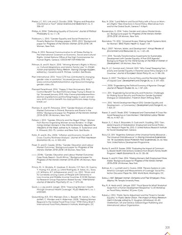 Ravindran, T.S. 2012. “Universal Access: Making Health Systems Work for Women.” BMC Public Health 12, Suppl 1: S4. Ray, I. 2007. “Women, Water, and Development.” Annual Review of Environment and Resources 32, no. 1: 421–49. . 2014. “Socially Transformative Investments for Sustainable Development with Gender Equality: A Post‐2015 Agenda.” Background Paper for the World Survey on the Role of Women in Development. UN Women, New York. Ray, R., J.C. Gornick and J. Schmitt. 2010. “Who Cares? Assessing Generosity and Gender Equality in Parental Leave Policy Designs in 21 Countries.” Journal of European Social Policy 20, no. 3: 196–216. Razavi, S. 2007. “The Return to Social Policy and the Persistent Neglect of Unpaid Care.” Development and Change 38, no. 3: 377–400. . 2009. “Engendering the Political Economy of Agrarian Change.” Journal of Peasant Studies 36, no. 1: 197–226. . 2011. “Engendering Social Security and Protection: Challenges for Making Social Security and Protection Gender Equitable.” Dialogue on Globalization. Friedrich-Ebert-Stiftung, Berlin. . 2012. “World Development Report 2012: Gender Equality and Development— a Commentary.” Development and Change 43, no. 1: 423–37. Razavi, S. and S. Staab. 2010. “Underpaid and Overworked: A Cross-National Perspective on Care Workers.” International Labour Review 149, no. 4: 407–22. Razavi, S., C. Arza, E. Braunstein, S. Cook and K. Goulding. 2012. “Gendered Impacts of Globalization: Employment and Social Protection.” Research Paper No. 2012–3. United Nations Research Institute for Social Development, Geneva. Roca, E.E. 2011. “Argentina: Extension of the Universal Family Allowance – The Universal Child Allowance.” In Sharing Innovative Experiences, Vol. 18: Successful Social Protection Floor Experiences, 23–42. New York: United Nations Development Programme. Rocha, R. and R.R. Soares. 2009. “Evaluating the Impact of Community-Based Health Interventions: Evidence from Brazil’s Family Health Program.” Health Economics 19, no. S1: 126–58. Roever, S. and M. Chen. 2014. “Making Women’s Self-Employment More Viable.” Background paper for Progress of the World’s Women 2015–2016. UN Women, New York. Rofman, R., L. Lucchetti and G. Ourens. 2008. “Pension Systems in Latin America: Concepts and Measurements of Coverage.” Social Protection Discussion Paper No. 0616. World Bank, Washington, DC. Rollins, J. 1987. Between Women: Domestics and Their Employers. Philadelphia, PA: Temple University Press. Roy, R., A. Heuty and E. Letouze. 2007. “Fiscal Space for What? Analytical Issues from a Human Development Perspective.” G-20 Workshop on Fiscal Policy, Istanbul, 30 June–2 July. Rubery, J. 2013. “Public Sector Adjustment and the Threat to Gender Equality.” In Public Sector Shock: The Impact of Policy Retrenchment in Europe, edited by D. Vaughan-Whitehead, 43–83. Cheltenham, UK and Geneva: Edward Elgar Publishing and International Labour Organization.