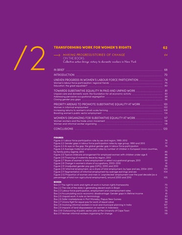 FIGURES Figure 2.1 Labour force participation rate by sex and region, 1990-2013 Figure 2.2 Gender gaps in labour force participation rates by age group, 1990 and 2013 Figure 2.3 An eye on the gap: the global gender gap in labour force participation Figure 2.4 Average maternal employment rates by number of children in European Union countries, by family policy regime, 2013 Figure 2.5 Typical childcare arrangement for employed women with children under age 6 Figure 2.6 Financing of maternity leave by region, 2013 Figure 2.7 Share of women in total employment in select occupational groups, 2013 Figure 2.8 Change in women’s share of occupations, 2000–2010 Figure 2.9 Unadjusted gender pay gap (GPG), 2000 and 2010 Figure 2.10 Informal employment, as a share of total employment, by type and sex, 2004–2010 Figure 2.11 Segmentation of informal employment by average earnings and sex Figure 2.12 Proportion of women and men in ‘unprotected’ employment over the past decade (as a percentage of total non-agricultural employment), around 2000 and 2010 BOXES Box 2.1 The right to work and rights at work in human rights frameworks Box 2.2 The role of the state in generating decent work in Brazil Box 2.3 Labour force participation, employment and unemployment rates Box 2.4 Accumulating socio-economic disadvantage: Gender gaps in lifetime income Box 2.5 Unpaid work: A note on terminology Box 2.6 Safer marketplaces in Port Moresby, Papua New Guinea Box 2.7 Unions fight for equal pay for work of equal value Box 2.8 Involving informal workers in local and municipal planning in India Box 2.9 Impacts of land dispossession on women in Indonesia Box 2.10 Outsourcing of public sector jobs at the University of Cape Town Box 2.11 Women informal workers organizing for change