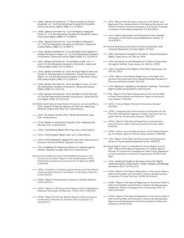 . 2014. “Report of the Secretary-General on the Review and Appraisal of the Implementation of the Beijing Declaration and Platform for Action and the Outcomes of the Twenty-Third Special Session of the General Assembly.” E/CN.6/2015/3. . 2015. Political Declaration on the Occasion of the Twentieth Anniversary of the Fourth World Conference on Women. E/ CN.6/2015/L.1. UN General Assembly (United Nations General Assembly). 1948. Universal Declaration of Human Rights. 217 A(III). . 1966. International Covenant on Economic, Social and Cultural Rights. Treaty Series, Vol. 993, No. 14531. . 1979. Convention on the Elimination of All Forms of Discrimination against Women. Treaty Series, Vol. 1249, No. 20378. . 1990. Convention on the Rights of the Child. Treaty Series, Vol. 1577, No. 27531. . 2006. “Report of the Special Rapporteur on the Right of Everyone to the Enjoyment of the Highest Attainable Standard of Physical and Mental Health.” A/61/338. . 2010. Resolution Adopted by the General Assembly: The Human Right to Water and Sanitation. A/RES/64/292. 2011. “Report of the Special Rapporteur on the Human Right to Safe Drinking Water and Sanitation: Report of the Secretary-General.” A/66/255. . 2012a. “Cultural Rights: Note by the Secretary-General.” A/67/287. . 2012b. “Integrating Non-Discrimination and Equality into the Post-2015 Development Agenda for Water, Sanitation and Hygiene: Note by the Secretary-General.” A/67/270. . 2013a. “Report of the Special Rapporteur on extreme poverty and human rights: Extreme poverty and human rights.” A/68/293. . 2013b. “Follow-up to the Special Session of the General Assembly on Children: Report of the Secretary-General.” A/68/269. . 2014. “Report of the Open Working Group of the General Assembly on Sustainable Development Goals.” A/68/970. UN Human Rights Council (United Nations Human Rights Council). 2007. “Report of the Special Rapporteur on Violence against Women, Its Causes and Consequences, Yakin Ertürk: Addendum to Communications to and from Governments.” A/HRC/4/34/ Add.1. . 2011a. Guiding Principles on Business and Human Rights: Implementing the United Nations ‘Protect, Respect and Remedy’ Framework (2011). A/HRC/17/31. . 2011b. “Report of the Special Rapporteur on the Human Right to Safe Drinking Water and Sanitation, Catarina De Albuquerque: Compilation of Good Practices.” A/HRC/18/33/Add.1. . 2012a. “Report of the Special Rapporteur on the Human Right to Safe Drinking Water and Sanitation, Catarina De Albuquerque. Addendum: Mission to Senegal (14 to 21 November 2011).” A/ HRC/21/42/Add.1. . 2012b. “Report of the Special Rapporteur on the Human Right to Safe Drinking Water and Sanitation, Catarina De Albuquerque: Stigma and the Realization of the Human Rights to Water and Sanitation.” A/HRC/21/42.