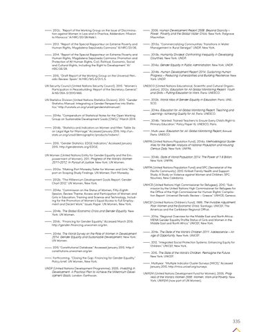. 2014a. Gender Equality in Public Administration. New York: UNDP. . 2014b. Human Development Report 2014: Sustaining Human Progress – Reducing Vulnerabilities and Building Resilience. New York: UNDP. UNESCO (United Nations Educational, Scientific and Cultural Organization). 2012a. Education for All Global Monitoring Report: Youth and Skills – Putting Education to Work. Paris: UNESCO. . 2012b. World Atlas of Gender Equality in Education. Paris: UNESCO. . 2014a. Education for All Global Monitoring Report: Teaching and Learning– Achieving Quality for All. Paris: UNESCO. . 2014b. “Wanted: Trained Teachers to Ensure Every Child’s Right to Primary Education.” Policy Paper 15. UNESCO, Paris. . Multi-year. Education for All: Global Monitoring Report, Annual. Paris: UNESCO. UNFPA (United Nations Population Fund). 2014a. Methodological Guidelines for the Gender Analysis of National Population and Housing Census Data. New York: UNFPA. . 2014b. State of World Population 2014: The Power of 1.8 Billion. New York: UNFPA. UNFPA (United Nations Population Fund) and SPC (Secretariat of the Pacific Community). 2010. Kiribati Family Health and Support Study: A Study on Violence against Women and Children. SPC: Noumea, New Caledonia. UNHCR (United Nations High Commissioner for Refugees). 2010. “Submission by the United Nations High Commissioner for Refugees for the Office of the High Commissioner for Human Rights’ Compilation Report: Universal Periodic Review – Greece.” UNHCR, Geneva. UNICEF (United Nations Children’s Fund). 1989. The Invisible Adjustment: Poor Women and the Economic Crisis. Santiago: UNICEF, The Americas and the Caribbean Regional Office. . 2011a. “Regional Overview for the Middle East and North Africa: MENA Gender Equality Profile Status of Girls and Women in the Middle East and North Africa.” UNICEF, New York. . 2011b. The State of the World’s Children 2011: Adolescence – An Age of Opportunity. New York: UNICEF. . 2012. “Integrated Social Protection Systems: Enhancing Equity for Children.” UNICEF, New York. . 2015. The State of the World’s Children: Reimagine the Future. New York: UNICEF. . Multiyear. “Multiple Indicator Cluster Surveys (MICS).” Accessed January 2015. http://mics.unicef.org/surveys. UNIFEM (United Nations Development Fund for Women). 2005. Progress of the World’s Women 2005: Women, Work and Poverty. New York: UNIFEM (now part of UN Women).