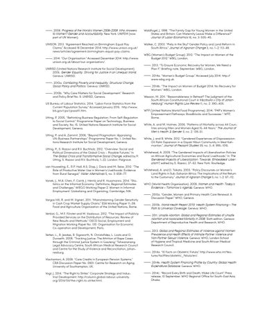 Waldfogel, J. 1998. “The Family Gap for Young Women in the United States and Britain: Can Maternity Leave Make a Difference?” Journal of Labor Economics 16, no. 3: 505–45. Walker, C. 2003. “Piety in the Sky? Gender Policy and Land Reform in South Africa.” Journal of Agrarian Change 3, no. 1–2: 113–48. WBG (Women’s Budget Group). 2012. “The Impact on Women of the Budget 2012.” WBG, London. . 2013. “To Ensure Economic Recovery for Women, We Need a Plan F.” Briefing note, September. WBG, London. . 2014a. “Women’s Budget Group.” Accessed July 2014. http:// www.wbg.org.uk. . 2014b. “The Impact on Women of Budget 2014: No Recovery for Women.” WBG, London. Wesson, M. 2011. “Reasonableness in Retreat? The Judgment of the South African Constitutional Court in Mazibuko v City of Johannesburg.” Human Rights Law Review 11, no. 2: 390–405. WFP (United Nations World Food Programme). 2014. “P4P’s Women’s Empowerment Pathways: Roadblocks and Successes “. WFP, Rome. White, A. and M. Holmes. 2006. “Patterns of Mortality across 44 Countries among Men and Women Aged 15–44 Years.” The Journal of Men’s Health & Gender 3, no. 2: 139–51. White, J. and B. White. 2012. “Gendered Experiences of Dispossession: Oil Palm Expansion in a Dayak Hibun Community in West Kalimantan.” Journal of Peasant Studies 39, no. 3–4: 995–1016. Whitehead, A. 2009. “The Gendered Impacts of Liberalization Policies on African Agricultural Economies and Rural Livelihoods.” In The Gendered Impacts of Liberalization: Towards ‘Embedded’ Liberalism?, edited by S. Razavi, 37–62. New York: Routledge. Whitehead, A. and D. Tsikata. 2003. “Policy Discourses on Women’s Land Rights in Sub-Saharan Africa: The Implications of the Return to the Customary.” Journal of Agrarian Change 3, no. 1–2: 67–112. WHO (World Health Organization). 2009. Women and Health: Today’s Evidence – Tomorrow’s Agenda. Geneva: WHO. . 2010a. “Gender, Women and Primary Health Care Renewal: A Discussion Paper.” WHO, Geneva. . 2010b. World Health Report 2010: Health System Financing – The Path to Universal Coverage. Geneva: WHO. . 2011. Unsafe Abortion: Global and Regional Estimates of Unsafe Abortion and Associated Mortality in 2008. Sixth edition. Geneva: Department of Reproductive Health and Research, WHO. . 2013. Global and Regional Estimates of Violence against Women: Prevalence and Health Effects of Intimate Partner Violence and Non-Partner Sexual Violence. Geneva: WHO, London School of Hygiene and Tropical Medicine and South African Medical Research Council. . 2014a. “10 Facts on Obstetric Fistula.” http://www.who.int/features/factfiles/obstetric_fistula/en/. . 2014b. Health System Financing Profile by Country: Global Health Expenditure Database. Geneva: WHO. . 2014c. “Record Every Birth and Death, Make Life Count.” Press release, 10 September. WHO Regional Office for South-East Asia, Dhaka.