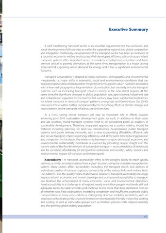 A well-functioning transport sector is an essential requirement for the economic and social development of all countries as well as for supporting regional and global cooperation and integration. Historically, development of the transport sector has been an indicator of a country’s economic welfare and success. Well-developed, efficient, safe and secure inland transport systems offer important access to markets, employment, education and basic services critical to poverty alleviation; at the same time, transportation is a major driving force behind a growing world demand for energy and it has a significant environmental footprint. Transport sustainability is shaped by socio-economic, demographic and environmental megatrends, i.e. major shifts in economic, social and environmental conditions that can impact people and transform societies. Present economic growth, which has been associated with a ‘reversed’ geographical fragmentation of production, has created particular transport patterns such as increasing transport volumes mostly in the non-OECD regions. At the same time, the significant changes in global population size, age structure, household size and urbanization expected in the twenty-first century may have substantial implications for inland transport, in terms of transport patterns, energy use and GreenHouse Gas (GHG) emissions. These will be further complicated by the mounting effects of climate change and inconsistency on the transport infrastructure and services. As a cross-cutting sector, transport will play an important role in efforts towards achieving post-2015 sustainable development goals. As such, in addition to their value and job creation, inland transport systems need to be considered partly as enablers of sustainable development. Therefore, integrated approaches to policy making should be fostered, including planning for land use, infrastructure development, public transport systems and goods delivery networks, with a view to providing affordable, efficient, safe and secure transport, improving energy efficiency, and at the same time reducing pollution and congestion. In this study, the relationship between transport and social, economic and environmental sustainability worldwide is assessed by providing deeper insight into the current state of the five dimensions of sustainable transport – access (mobility of individuals and for societies), affordability (of transport for individuals and society), safety, security and environmental impact (of transport and on transport). Accessibility - In transport, accessibility refers to the peoples’ ability to reach goods, services, activities and destinations from a given location, using the available transportation system. Many factors affect accessibility, including the transport needs and abilities of individuals, quality of transport options, connectivity of the various links and modes, landuse patterns, and the quality/costs of alternative solutions. Transport accessibility has large impacts in both economic and human development, as improved accessibility to transport can facilitate the achievement of many economic, social and environmental objectives. Rural accessibility is a challenge in all regions; nearly one billion people worldwide still lack adequate access to road networks and continue to live more than two kilometres from an all-weather road. Fast urbanization, increasing congestion and insufficient access to public transportation in many areas call for a redesigning of urban mobility conditions, with an emphasis on facilitating infrastructure for more environmentally friendly modes like walking and cycling, as well as vulnerable groups such as children, persons with reduced mobility and the growing global elderly population.