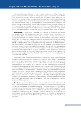 International transport links are the most important facilitator of global trade and a prerequisite for economic development. Participation in global supply chains is essential for attracting foreign investment and enterprises as well as human capital. In many areas it is hampered by underdeveloped international transport links which undermine national and regional competitiveness. Foreign trade is especially important for small, land-locked and sea-locked economies, which are also dependent on hinterland and/or sea connections and border crossings. Emerging land- and sea-locked economies require particular attention, as their geography constrains trade and economic development. Inefficient border crossings reduce the efficiency of global trade, and are a particular challenge in parts of South-eastern Europe, the Caucasus, Central and East Asia, countries of the UNESCWA region and Africa. Affordability - Transport costs money and, thus, transport accessibility is controlled by the costs (and returns) of the passenger and freight transport services as well as by the sustainability of the investments associated with upgrading, planning and construction of new transportation infrastructure. Transport affordability refers to the financial ability of people and societies to access adequate transport services without compromising their ability to purchase other basic goods and services, such as food, housing, education and health. It can be assessed from several perspectives, e.g. the level of private motorization, the costs of owning, driving and parking private vehicles as well as the quality and cost of alternative transport modes such as public transport and cycling. High income inequalities are an issue present in all regions, and low income groups, which spend a high proportion of their income on transport, are especially dependant on the availability of affordable public transport. At the same time, in the present global economic climate, national and local government capacities to offer affordable public transport are diminished by a lack of availability of public funds. All available trends and projections relating to passenger and freight volumes suggest a strong future growth particularly in the non-OECD regions (see Chapter 2). The expected growth in freight and passenger transport will require planning and construction of new transportation infrastructure as well as the establishment of sustainable funding mechanisms for the transport sector. Efficient, safe and environmentally sustainable transport infrastructure is expensive and, despite recent improvements, transport networks in many regions still suffer from the under-investment of the previous decades. At the same time, infrastructure development is generally planned and financed within national budgets and under macro-economic constraints, and in competition with other needs such as education, health, housing or security. The 2008 financial crisis and its aftermath have increased pressures on national budgets and reduced public funding for transport infrastructure development, increasing the importance of private sector funding (as well as hybrid financing through public-private partnerships), and warranting more rigorous project feasibility assessment. Safety -Transport related injuries are a serious social, economic and development issue. Developing countries and economies in transition bear the majority of this burden so transport fatalities and injuries are a development issue that disproportionately affects the poor in low and middle-income countries. Globally, well over a million people are killed annually in road traffic accidents causing, in addition, to human loss and suffering, billions of dollars of associated costs which amounts, in some countries, to 1-3 per cent of GDP. Underreporting and insufficient global harmonization of statistics are obstacles to improving insight into transport safety challenges — the first step in efforts to develop solutions.