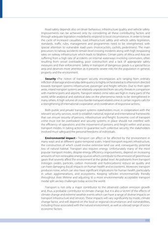 Road safety depends also on driver behaviour, infrastructure quality and vehicle safety. Improvements can be achieved only by considering all these contributing factors and through adequate legislation modelled to respond to local circumstances. In order to break the cycle of increased casualties, road infrastructure safety and vehicle safety legislation, standards, traffic rules, management and programmes need to be strengthened, with special attention to vulnerable road users (motorcyclists, cyclists, pedestrians). The main precursors to railway accidents remain level crossing incidents along with high trespassing rates on railway infrastructure which leads to fatalities. Certain parts of Africa and Asia are suffering from a high rate of accidents on internal waterways involving commuters, often resulting from vessel overloading, poor construction and a lack of appropriate safety measures and their enforcement. Safety in transport of dangerous goods is a special focus area and deserves more attention as it presents severe risks for the population in general, property and the environment. Security -The notion of transport security encompasses acts ranging from ordinary infliction of damage and everyday delinquency to highly orchestrated acts of terrorism directed towards transport systems infrastructure, passenger and freight vehicles. Due to their open areas, inland transport systems are relatively unprotected from security threats in comparison with maritime ports and airports. Transport related crime rates are high in many parts of the world, while analytical and statistical data on the phenomena needs to be strengthened in many others. A high volume of cross-border transport related crime in certain regions calls for a strengthening of international cooperation and coordination of responsive actions. Both public and private transport systems stakeholders must, in cooperation with the relevant security services, work to establish national, regional and international frameworks that can ensure security of persons, infrastructure and freight. Economic cost of transport crime must not be overlooked and security systems in place should not interfere with the efficiency of operations and the movement of persons and freight within and across transport modes. In taking actions to guarantee such collective security, the stakeholders involved must safeguard the personal freedoms of individuals. Environmental impact - Transport can affect or be affected by the environment in many ways and at different spatio-temporal scales. Inland transport requires infrastructure, the construction of which could involve extensive land use and, consequently, potential loss of natural habitat. Transport also requires energy. Unfortunately many of the most popular transport modes, despite energy efficiency improvements, depend on increasing amounts of non-renewable energy sources which contribute to the emission of greenhouse gases that severely affect the environment at the global level. Air pollutants from transport (nitrogen oxides, particles, carbon monoxide and hydrocarbons) reduce air quality and can have damaging (local) impacts on human health and ecosystems. Moreover, transport produces noise, which can also have significant implications for human health, particularly in urban agglomerations, and ecosystems. Keeping vehicles environmentally friendly throughout their lifetime and adjusting to a more environmentally acceptable transport modal split are key challenges today across the world. Transport is not only a major contributor to the observed carbon emission growth and, thus, a probable contributor to climate change, but it is also a ‘victim’ of the effects of climate change and extreme weather events which can have a range of diverse impacts on transport infrastructure and services. These impacts will vary significantly by mode, climate change factor, and will depend on the local or regional circumstances and vulnerabilities, including those associated with the natural environment, as well as a broad range of socioeconomic factors.