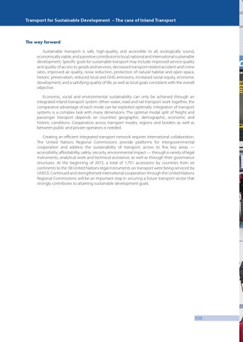 Sustainable transport is safe, high-quality, and accessible to all, ecologically sound, economically viable, and a positive contributor to local, national and international sustainable development. Specific goals for sustainable transport may include: improved service quality and quality of access to goods and services, decreased transport related accident and crime rates, improved air quality, noise reduction, protection of natural habitat and open space, historic preservation, reduced local and GHG emissions, increased social equity, economic development, and a satisfying quality of life, as well as local goals consistent with the overall objective. Economic, social and environmental sustainability can only be achieved through an integrated inland transport system. When water, road and rail transport work together, the comparative advantage of each mode can be exploited optimally. Integration of transport systems is a complex task with many dimensions. The optimal modal split of freight and passenger transport depends on countries’ geographic, demographic, economic and historic conditions. Cooperation across transport modes, regions and borders as well as between public and private operators is needed. Creating an efficient integrated transport network requires international collaboration. The United Nations Regional Commissions provide platforms for intergovernmental cooperation and address the sustainability of transport, across its five key areas — accessibility, affordability, safety, security, environmental impact — through a variety of legal instruments, analytical work and technical assistance, as well as through their governance structures. At the beginning of 2015, a total of 1,701 accessions by countries from six continents to the 58 United Nations legal instruments on transport were being serviced by UNECE. Continued and strengthened international cooperation through the United Nations Regional Commissions will be an important step in securing a future transport sector that strongly contributes to attaining sustainable development goals.